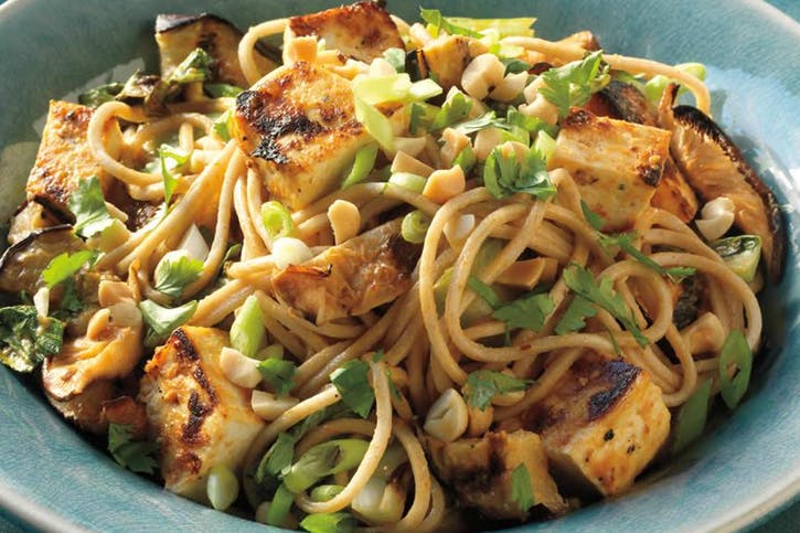 07 Zeleninu a tofu nakrájajte na kúsky a vložte do misky s rezancami. Polejte dresingom. Rozdeľte medzi štyri servírovacie taniere a vrchnú časť s škoricami, koriandrom a arašidmi.