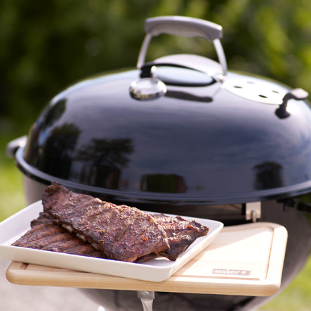 4. Rebrá osoľte, vložte ich do stojanu na rebierka Weber a grilujte po dobu 1-1 ½ hodiny nepriamou metódou na strednom žiaru. 20 minút pred koncom grilovania potrite rebrá grilovacou omáčkou. Rebrá podávajte so zvyškom omáčky.