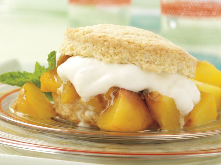 06 Odstráňte spálenú pokožku z broskýň a zlikvidujte ju. Broskyne nakrájajte na kúsky veľkosti sústo a pridajte ich do misy so šťavami. Jemne hoďte na kabát. Každý koláč rozdeľte vodorovne a každú spodnú polovicu rovnomerne rozotrite broskyňami a šľahačkou. Pridajte topy koláčov a podľa potreby ozdobte vetvičkami mäty.