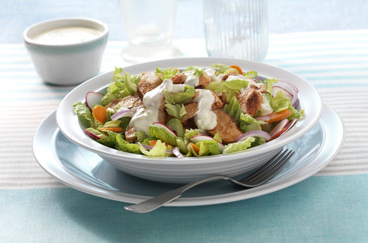 05 V širokej šalátovej miske kombinujte šalát, zeler, mrkvu, reďkovky a cibuľu. Kura umiestnite do stredu šalátu. Dresing polejte na kurča. Ozdobte zelerovými listami.