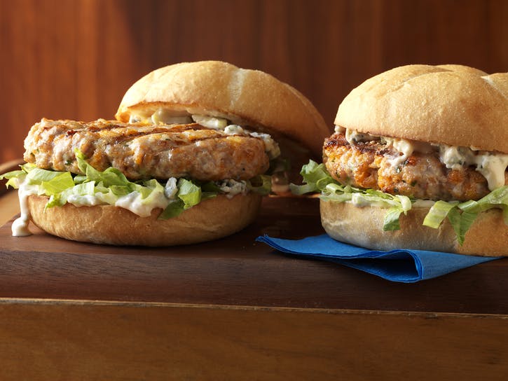 05 Natrite rozrezanú stranu každej buchty s majonézou z modrého syra a potom ho posypte šalátom. Podávame teplé.