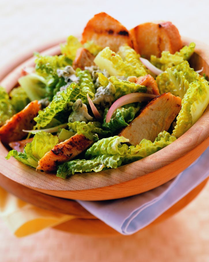 05 Vo veľkej miske kombinujte šalát, cibuľu a kurča. Pridajte dostatočné množstvo dresingu, aby ste listy zľahka potiahli (možno nebudete potrebovať všetok dresing). Pridajte plátky opečenej bagety. Dochutíme korením. Premiešajte. Podávajte ihneď.