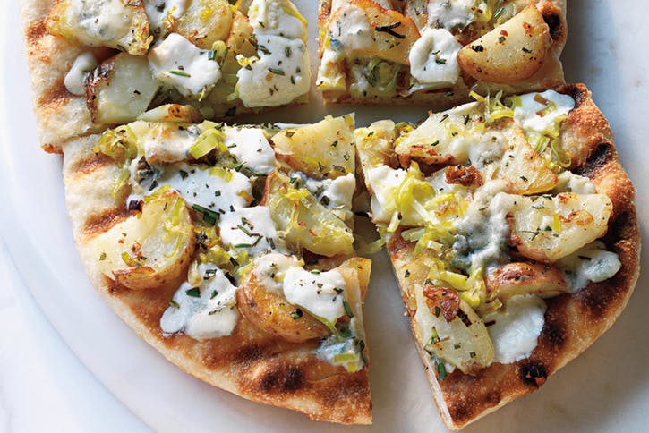 05 Jednu stranu každého kusu cesta natrite olejom. Cesto položte na rošt na varenie tak, aby strany papiera smerovali nahor. Grilujte na priamom strednom ohni so zatvoreným vekom, až kým vrch cesta nevytvára bubliny a spodná strana nie je krehká a zlatistá asi 3 minúty. Odlúpnite a zlikvidujte papier. Kôry premiestnite na pracovnú plochu s grilovanými stranami smerom nahor. Okamžite rozotrite každú kôru rovnakým množstvom zmesi zemiakov a póru, mozzarelly a modrých syrov a zostávajúceho rozmarínu, pričom zostane hranica 0,5 cm.