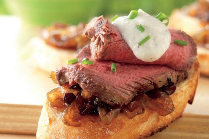 07 Naneste vrstvu džemu na každý kúsok opečenej bagety (crostini). Položte kúsok mäsa na džem a na vrchol s malým údom chrenového krému. Ak je to potrebné, posypte nasekanou čerstvou pažítkou.