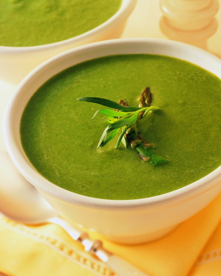 03Pridajte kurací vývar, špenát a korenie na panvicu. Zmes nechajte variť v peci na vysokej teplote. Znížte teplotu na stredne nízku teplotu a nechajte ju miešať 4 až 5 minút, aby sa do nej pridali chute. Pomocou štrbinovej lyžice preneste zeleninu do kuchynského robota a rozmixujte. Zeleninu z pyré vráťte do panvice a dobre premiešajte. Rozšľahajte smotanu a estragón. Teplú polievku zohrejte na stredne nízku teplotu po dobu 3 až 5 minút, ale nenechajte ju vrieť alebo sa môže oddeliť. Dochutíme soľou a podávame teplé.