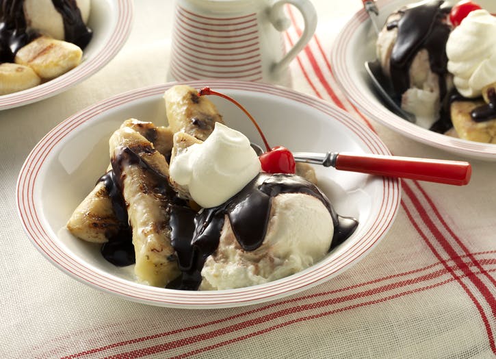 05 V prípade potreby omáčku znovu zohrejte v mikrovlnnej rúre s vysokým výkonom v 15 sekundových krokoch, kým nebude teplá, ale nie horúca. Do každej zo šiestich misiek alebo pohárikov vložte dve polovice banánov (možno ich budete musieť nakrájať na polovicu, aby sa zmestili na vašu misku). Pridajte kopčeky zmrzliny, teplej omáčky, šľahačky a čerešní. Podávajte ihneď.