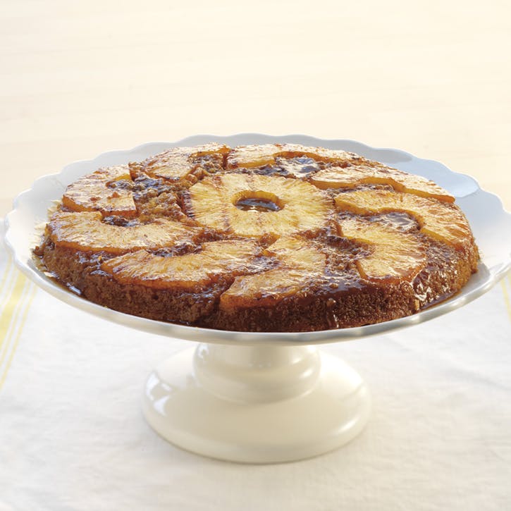 07 Pred vybratím koláča z panvice spustite rozrezávací nôž okolo okraja, aby ste ho uvoľnili. Na vrchol panvy položte servírovací tanier, dostatočne veľký na to, aby udržal koláč. Noste grilovacie rukavice bez prstov, opatrne prevráťte panvicu a tanier súčasne a pomaly ju vyberte. Vymeňte akýkoľvek ananás, ktorý uviazol na spodnej časti panvy. Pred krájaním a podávaním nechajte koláč krátko vychladnúť. Koláč sa najlepšie podáva teplý alebo pri izbovej teplote v deň jeho výroby.