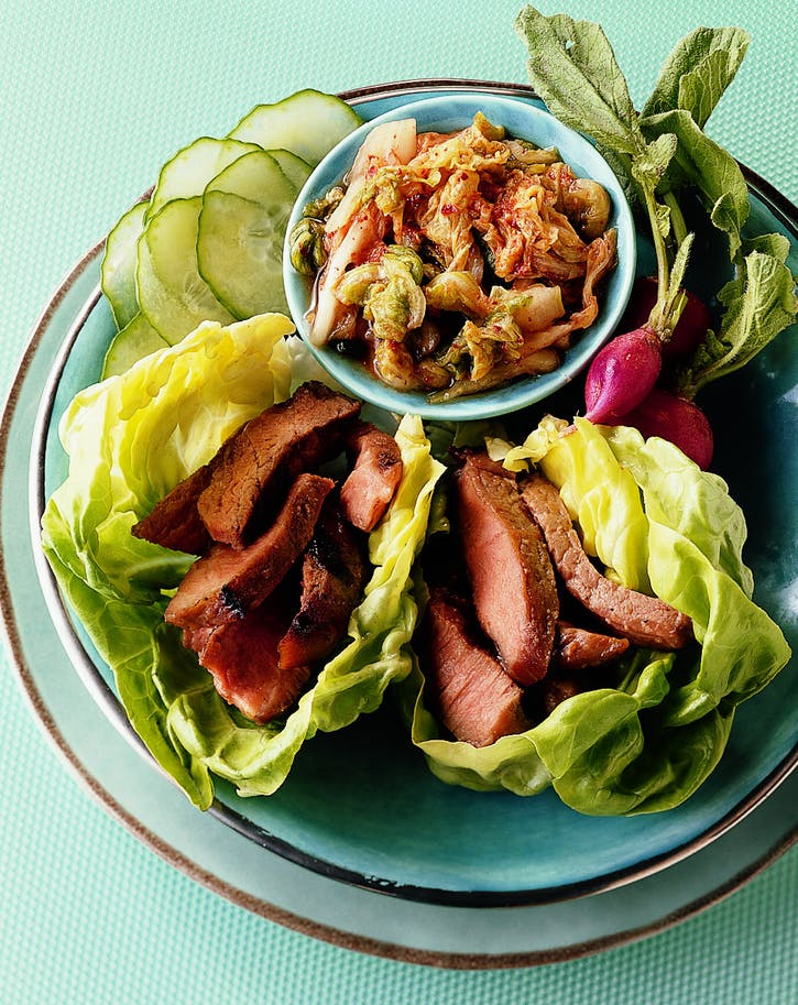 06 Vyberte celý list hlávkového šalátu, na vrch roztiahnite trochu gochujangu (červená chilli pasta), ak je to potrebné, usporiadajte steak a kimchi do stredu a zviňte.