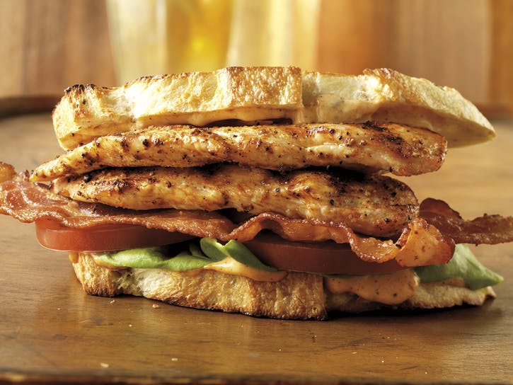 07 Rozkrájajte plátky chleba rovnomerne s korenenou majonézou. Zložte každý sendvič s dvoma listami šalátu, dvoma plátkami paradajok, dvoma slaninovými prúžkami a dvoma kuracími prúžkami. Podávajte ihneď.