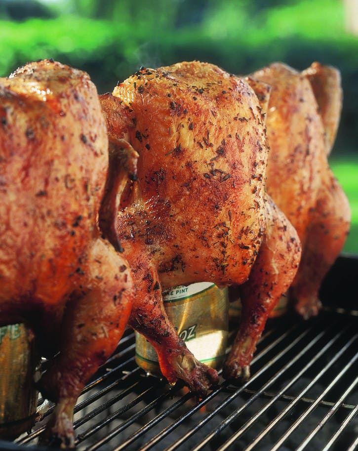 04 Otvorte plechovku na pivo a vylejte polovicu piva. Ak použijete otvárač na otváranie konzerv, urobte v hornej časti plechovky ďalšie dve diery. Položte plechovku na rovný povrch a posuňte kurča cez vrch tak, aby plechovka zapadla do dutiny. Preneste kurča na plechovku na gril a udržujte plechovku vo zvislej polohe. Opatrne vyvážte kurča na dvoch nohách a plechovke. Grilujte na nepriamom strednom ohni so zatvoreným vekom, až kým šťavy nevyprchajú 1 až 1½ hodiny.
