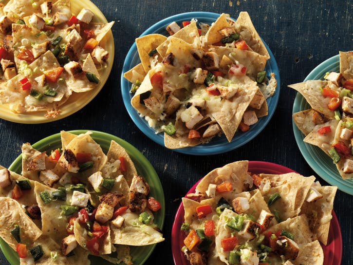 04 Vrstvené tortilla chipsy, kuracie kúsky, poblano, papriku, syr a póriky položte na dve veľké plachty s pergamenovým papierom. Plechové misky umiestnite na nepriame stredné teplo (pravdepodobne budete musieť nachos uvariť v dvoch šaržiach), zatvorte vrchnák a varte do 5 až 10 minút, kým sa syr neroztopí. Vyberte z grilu, posypte koriandrom a ak sa používa, okamžite podávajte so salsou a kyslou smotanou.
