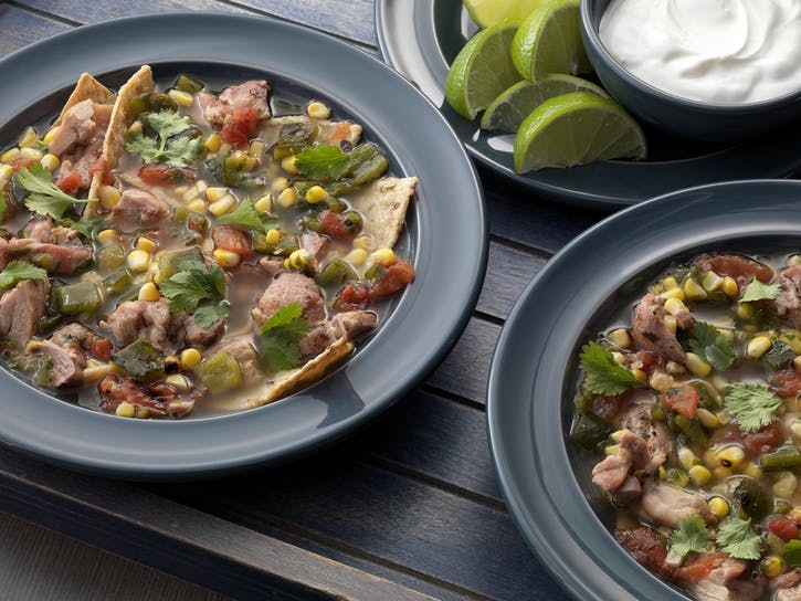 07 Vložte malú hrsť tortilla chips do každej misky na polievku a naberte polievku. Podávajte horúce so zvyškom koriandra, limetkových klinov a kyslej smotany.