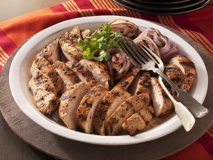 03 Mriežky na varenie vyčistite. Plátky cibule opláchnite olejom. Vyberte kurča z vaku a marinádu zlikvidujte. Kuracie mäso rovnomerne osolíme soľou a korením a potom grilujte na priamom strednom ohni so zatvoreným vekom, až kým nebude mäso na dotyk pevné a ružové v strede, 8 až 12 minút, raz otočené. Súčasne grilujte cibuľu na priamom strednom ohni, kým nie je krehká, 12 až 15 minút, otáčaním raz alebo dvakrát. Keď sú hotové, vyberte ich z grilu a nechajte kurča odpočívať 3 až 5 minút.