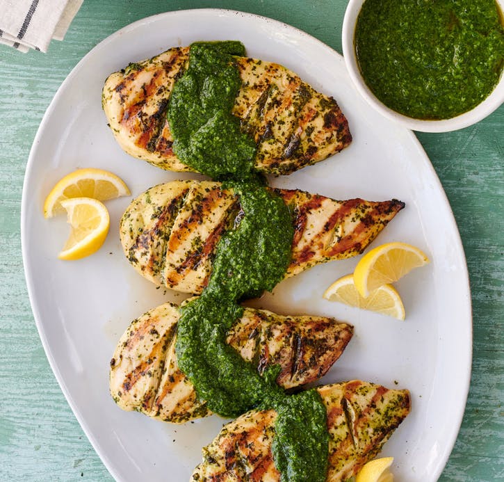08 Vyberte z grilu a nechajte niekoľko minút odpočívať. Podávajte s odloženou salsou a citrónovými rezmi.