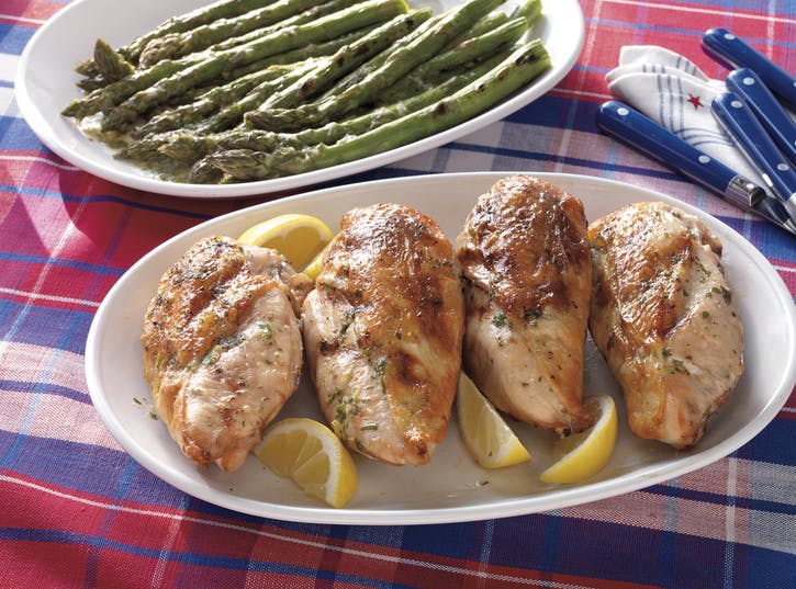 06 Kuracie prsia očistite olejom a rovnomerne osoľte soľou a korením. Kuracie mäso grilujte stranou nahor, na priame teplo, so zatvoreným vekom, asi na 5 minút pekne vyznačeným na dne. Bez toho, aby ste kurča otočili, posuňte ho nepriamym stredným teplom, zavrite veko a pokračujte vo varení, asi o 30 minút viac. Asi 5 minút pred tým, ako je kurča hotové, prikrývajte vrchy trochou roztopeného citrónového masla a potom prsia otočte kožou smerom nadol. Posuňte nad priamy ohrev, zatvorte veko a pokračujte vo varení, až kým nebude pokožka hnedá, ešte raz zalejte citrónovým maslom. Vyberte z grilu, prikryte a nechajte odpočinúť 3 až 5 minút.