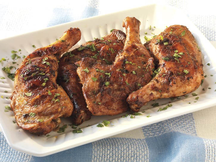04 Vyberte kurča z vaku a marinádu zlikvidujte. Kuracie mäso položte kožou nadol na nepriame stredne vysoké teplo. Na kurča položte plech a zavážte ho dvoma tehlami zabalenými vo fólii. Zatvorte veko a varte, až kým nie je zlaté okolo okrajov, 20 až 25 minút. Rukavicami vyberte tehly a plech z roštu a pomocou veľkej špachtle opatrne prevráťte kuracie stehná, pričom dávajte pozor, aby ste kožu neroztrhli. Odstráňte panvicu a závažie, zavrite veko a varte dovtedy, kým šťavy nie sú číre a kým mäso už nie je ružové pri kosti, asi o 20 minút dlhšie. Vyberte z grilu, ozdobte koriandrom a mätou a podávajte teplé.