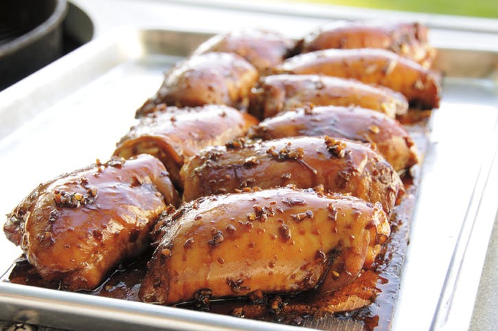 06 Vyberte stehná z misky a glazúru odoberte. Usporiadajte stehná na doske a varte na priamom ohni so zatvoreným vekom po dobu 5 až 10 minút. Dosku potom premiestnite na nepriame stredné teplo a pokračujte vo varení so zatvoreným vekom, až kým nepustí šťavu, 20 až 30 minút, pričom počas posledných 10 až 15 minút grilovania príležitostne nalejte rezervovanú glazúru. Pred podávaním vyberte z grilu a ešte raz polejte glazúrou.