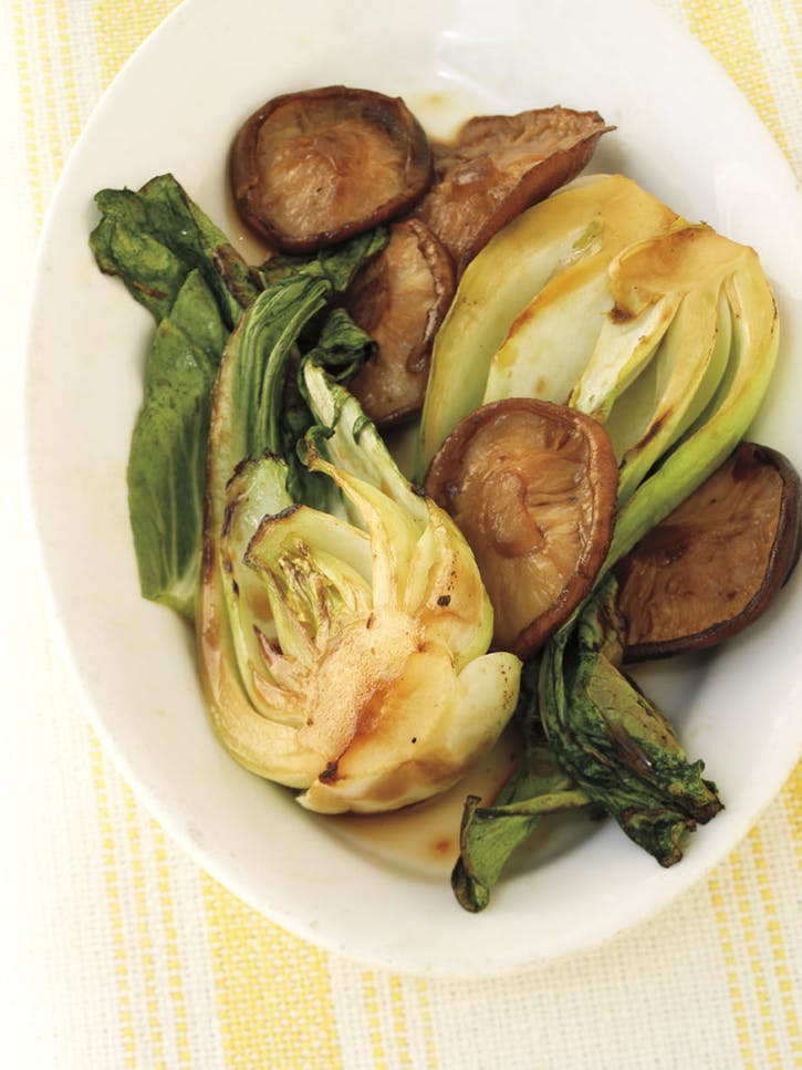 05 Odstráňte zeleninu z vrecka a nechajte si marinádu. Keď je grilovacia panvica horúca, rozložte bok choy a huby na panvicu v jednej vrstve. Grilujte na priamom strednom ohni, so zatvoreným vekom, až kým nie je bok choy krehký a shiitakes sú zohrievané asi 5 minút, raz alebo dvakrát sa otáčajú a príležitostne poliate s odloženou marinádou. Podávajte horúce.
