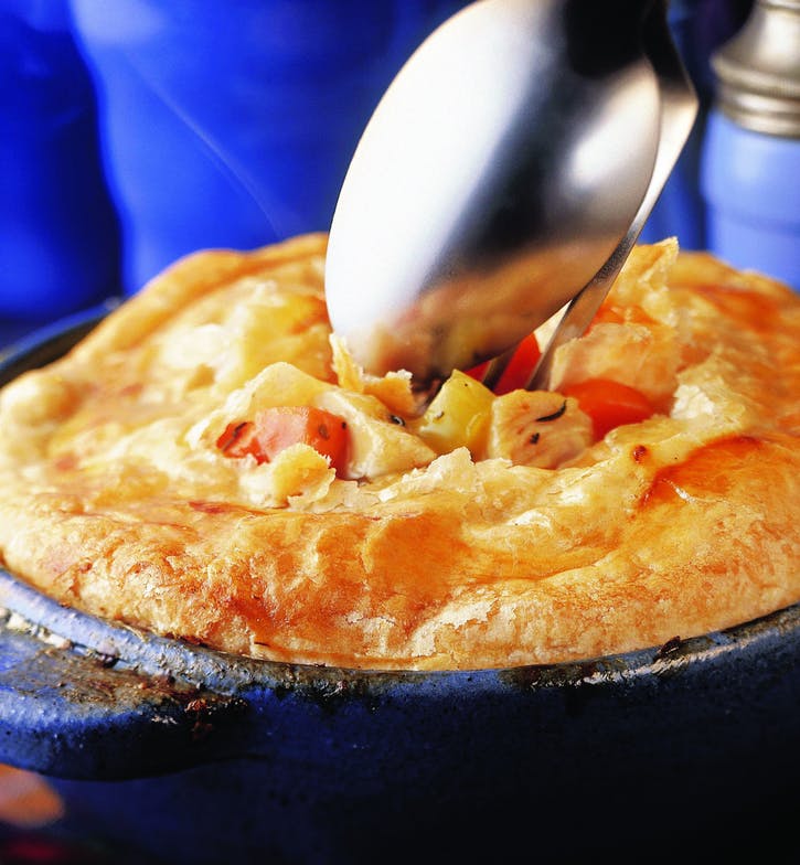 03 Do veľkej panvice s omáčkou pridajte uvarenú zeleninu, morčacie mäso, petržlen, citrónovú šťavu, soľ a korenie; vráťte ju k varu a varte 1 minútu. Preneste zmes na panvicu odolnú proti horeniu alebo do hlbokých koláčov.