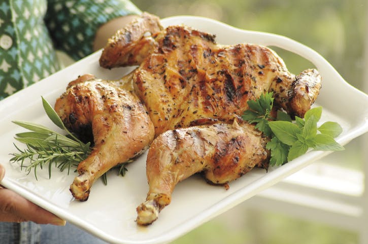 05 Mriežky na grilovanie vyčistite. Kuracie mäso položte stranou nadol, na priame stredne nízke teplo a na hornú časť kurča dajte liatinovú panvicu. Zatvorte veko a varte 20 až 30 minút. Odstráňte panvicu, otočte kurča, nasaďte panvicu, zavrite veko a varte, kým nedôjde k uvoľneniu šťavy, 20 až 30 minút. Vyberte z grilu a nechajte pôsobiť 5 až 10 minút (vnútorná teplota počas tejto doby stúpne). Nakrájajte kura na kúsky a podávajte teplé.