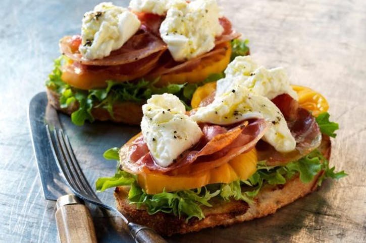 06 Na každú zo štyroch tanierov vložte dva plátky chleba opečené stranou nahor. Pridajte miešanú zeleninu do stredne veľkej misky s vinaigrette a premiešajte. Rozdeľte listy šalátu rovnomerne medzi osem kúskov chleba. Navrch plátky paradajok, pancetta a syr rovnomerne rozdeľte. Pokvapkajte všetku zvyšný balzamikový ocot. Podávame teplé.