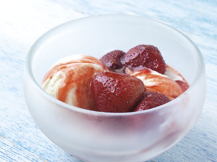 05 Nalejte šťavu z panvy na bobule, aby ste ich navlhčili a nechali vychladnúť 5 minút. Opatrne nakrájajte na štvrtiny alebo nechajte celé. Prelejte jahodami zmrzlinu.