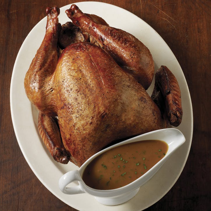 11 Preneste morčacie mäso na krájaciu dosku, voľne prikryte fóliou a pred rezaním nechajte pôsobiť 20 až 30 minút (vnútorná teplota počas tejto doby stúpne o niekoľko stupňov). Uložte obsah misky, aby ste získali omáčku.