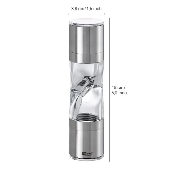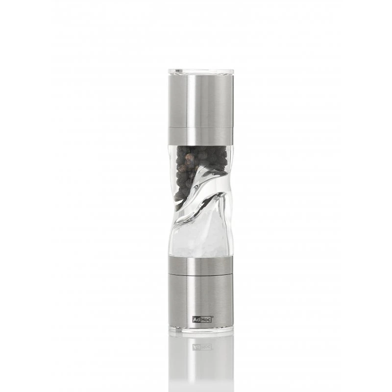 Dvojitý mlynček AdHoc Duomill Pure Mini vyrobený z nehrdzavejúcej ocele a akrylu s dvoma samostatnými keramickými mlynčekmi na korenie a soľ.