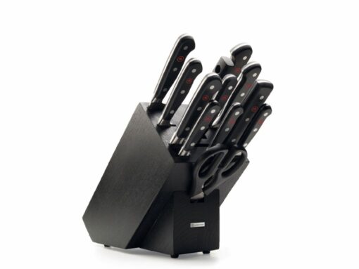 Praktický blok s nožmi poskytuje ochranu čepeliam vašich nožov, rovnako ako podčiarkuje moderný dizajn vašej kuchyne. 12 dielna sada nožov Classic v bloku – v novom dizajne a s novým obsahom. Jeho vzhľad sám o sebe zaujme ako dizajnový i praktický doplnok kuchyne. Vyrobený je z jaseňového dreva v čiernej farbe a bezpečne uschová 10 kuchynských nožov, ocieľku a nožnice.