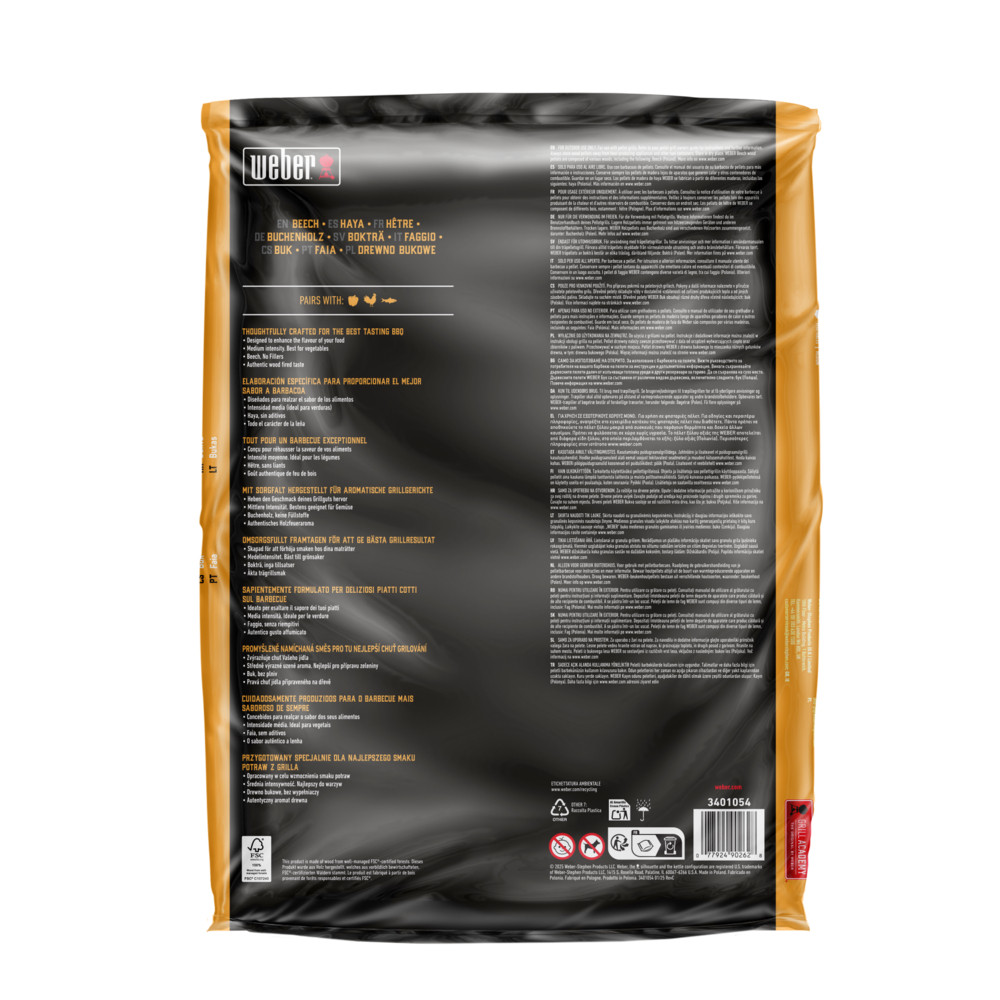 Weber drevené pelety Buk boli starostlivo vyrobené pre najlepšiu chuť grilovania. Dodajú jedlu údenú chuť so zemitým, orechovým a jemne sladkým profilom.