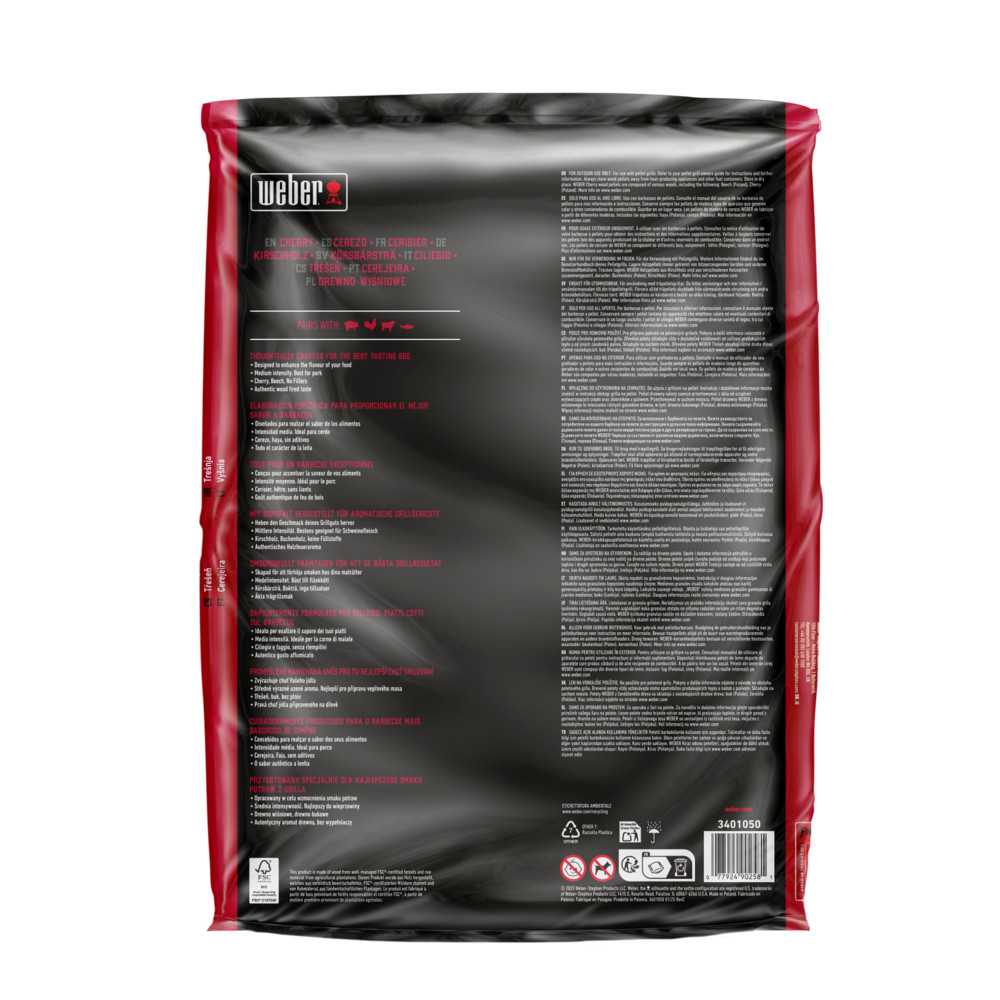 Weber prírodné drevené pelety Čerešňa boli starostlivo vyrobené pre najlepšiu chuť grilovania. Navrhnuté na zvýraznenie chuti Vášho jedla bez plnív, čistá autentická chuť dreva. Čerešňa dodá jedlu jemnú, ovocnú a sladkú údenú chuť. Čerešňa sa dokonale hodí k bravčovému mäsu, kuraciemu mäsu, jahňaciemu mäsu, divine a rybám.
