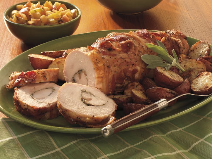 02 V malej miske kombinujte 1 polievkovú lyžicu rozmarínu, šalvie, citrónovú kôru, cesnak, ½ lyžičky soli a ¼ lyžičku korenia. Zmes posypte rovnomerne cez morčacie prsia a potom morčacie prsia roztočte pozdĺžne, aby ste vytvorili valec. Zakryte plátky pancetty, mierne ich prekrývajte a potom v 5 cm intervaloch zviažte valec s mäsiarskym motúzom, aby ste pancettu zaistili a udržali jej tvar. Vonkajšie strany natrite roztaveným maslom. Rovnomerne osoľte 1 lyžičkou rozmarínu, ¾ lyžičkou soli a ½ lyžičkou korenia.