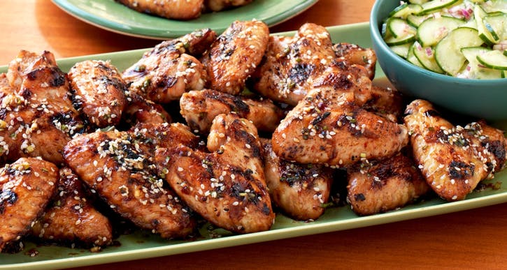 05 Mriežky na grilovanie vyčistite. Krídla grilovať na priamom ohni, so zatvoreným vekom, do zlatohneda, 10 až 15 minút, otáčaním raz alebo dvakrát. Krídla posuňte na nepriame stredné teplo a pokračujte v grilovaní, až kým koža nie je tmavohnedá a krehká a mäso už nie je ružové pri kosti, asi o 10 minút. Premiestnite krídla do veľkej misky s rezervovanou glazúrou a obaľte. Krídla podávajte teplým uhorkovým šalátom.