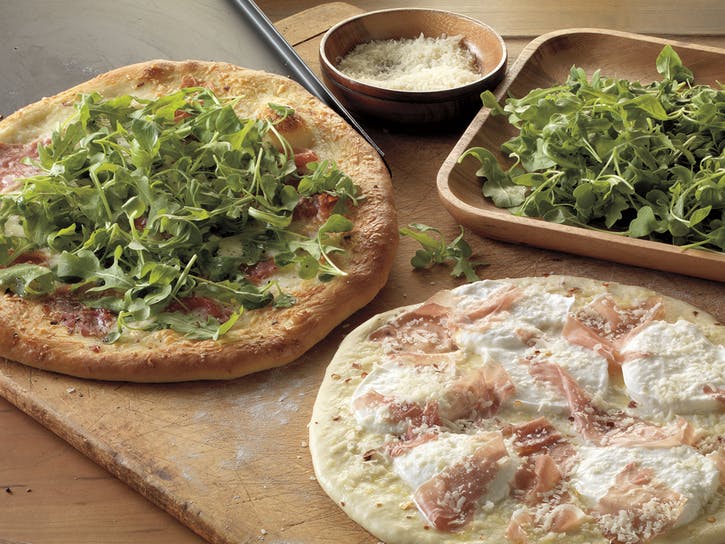 07 Pomocou špachtly na pizzu preneste pizzu z kameňa na veľkú krájaciu dosku alebo plech na pečenie a okamžite rozprestrite polovicu rukoly na pizzu. Nechajte pizzu odpočívať niekoľko minút. Pred podávaním jemne polejte pizzu olivovým olejom a dochutíme korením. Nakrájajte na kliny a podávajte teplé.