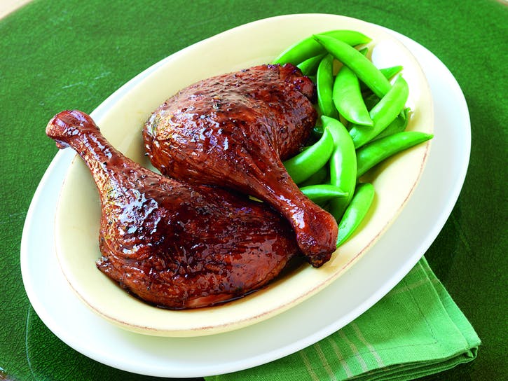 04 Vyčistite rošt na varenie. Pridajte drevené kúsky na drevené uhlie (alebo do údiacej skrinky na plynový gril podľa pokynov výrobcu). Keď drevo začne dymiť, varte kačicu, strana pokožky nahor, cez nepriame stredné teplo, so zatvoreným vekom, kým kačica nie je rovnomerne zhnednutá a chrumkavá a úplne uvarená asi 1 hodinu. Počas posledných 15 až 20 minút grilovania kačicu každých 5 až 10 minút otočte a prelejte glazúrou. Podávame teplé.