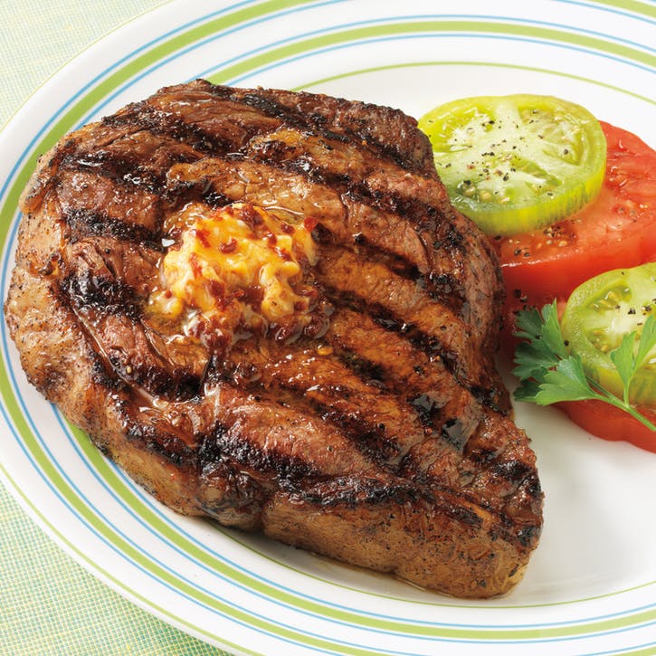 04 Steaky grilujte na priamom horúcom mieste so zatvoreným vekom, kým nie sú uvarené na želanú tvrdosť, 6 až 8 minút, raz alebo dvakrát otáčajte (ak dôjde k vzplanutiu, posuňte steaky dočasne nad nepriame teplo). Vyberte z grilu a natrite maslom. Nechajte odpočívať 3 až 5 minút. Podávame teplé.