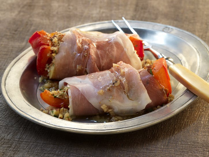 05 Plátky šunky položte na pracovnú plochu. Na každú šunkovú šunku umiestnite krížový klin vždy asi 3 palce od jedného konca. Každý korenie nasypte holiacim syrom a potom rozdeľte zmes drobčekov na plátky korenia. Zložte kratší koniec šunky cez korenie a všetko prevráťte, aby ste náplň úplne uzavreli. Položte zvitky zvitkov dolu na tanier. Pokvapkajte časť zvyšku viniča cez rožky. Podávajte pri izbovej teplote.