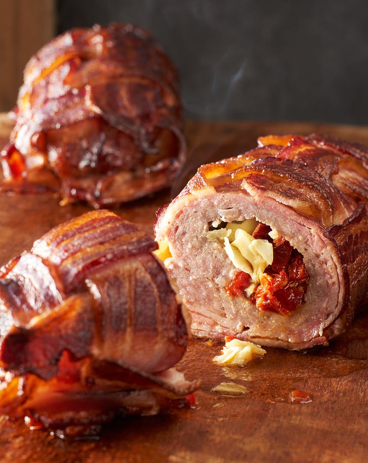 05 Položte veľký list voskového papiera na iný pracovný povrch. Stlačte jednu z porcií mäsa na štvorcový tvar. Asi 2 palce od najbližšej strany usporiadajte polovicu artičokov, polovicu paradajok a polovicu papriky rovnobežne s vodorovnými čiarami, pričom na oboch koncoch nechajte asi 1 palec. Zdvihnutý voskovaný papier pod klobásovou zmesou, zmes pevne stočte okolo zeleniny a potom zovrite konce, aby ste všetko uzavreli. To by malo vyzerať ako malý bochník na mäso. Položte tento bochník na mäso na okraj slaniny, ktorá je najbližšie k vám. Na pomoc použite voskový papier pod slaninou, prevlečte prikrývku slaniny okolo klobásy a zastrčte jej konce. Odložte. Opakujte so zostávajúcimi ingredienciami, čím vytvoríte druhý obalený bochník.