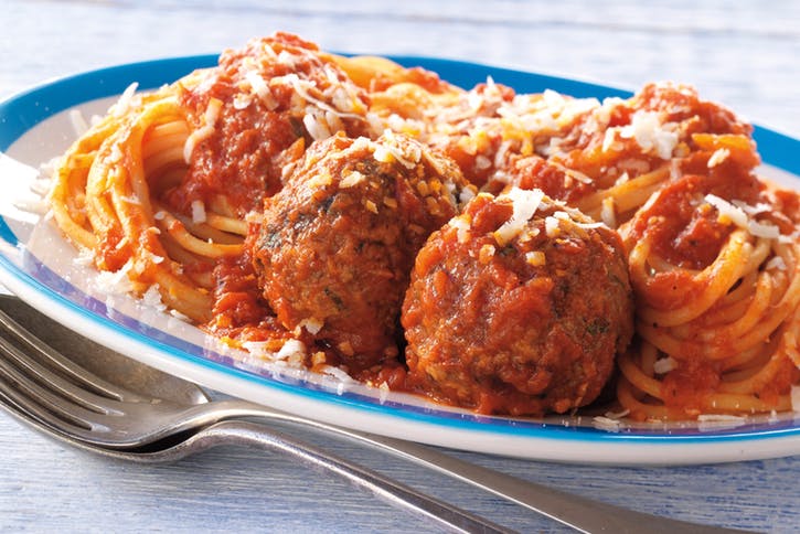05 Medzitým v 3 – 4-kvartovom hrnci na miernom ohni na sporáku zahrievajte cestovinovú omáčku. Špagety varte vo veľkej nádobe vriacej vody podľa pokynov na obale. Keď sú mäsové guľky hotové, pridajte ich do horúcej cestovinovej omáčky a mierne pomaly varte, kým cestovina dokončí varenie. Vypustite cestoviny, premiešajte ich omáčkou a s mäsovými guľkami a podávajte horúce s čerstvo nastrúhaným syrom.