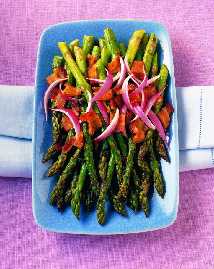 05 Mriežky na grilovanie vyčistite. Špargľu grilujte na priamom a strednom ohni, so zatvoreným vekom, až do zapečenia škvŕn, ale bez ohňa, 6 až 8 minút, občas otočte. Špargľu umiestnite na servírovací tanier. Posypeme slaninou cez špargľu. Naaranžujte cibuľu na tanier. Podávajte teplé alebo pri izbovej teplote.