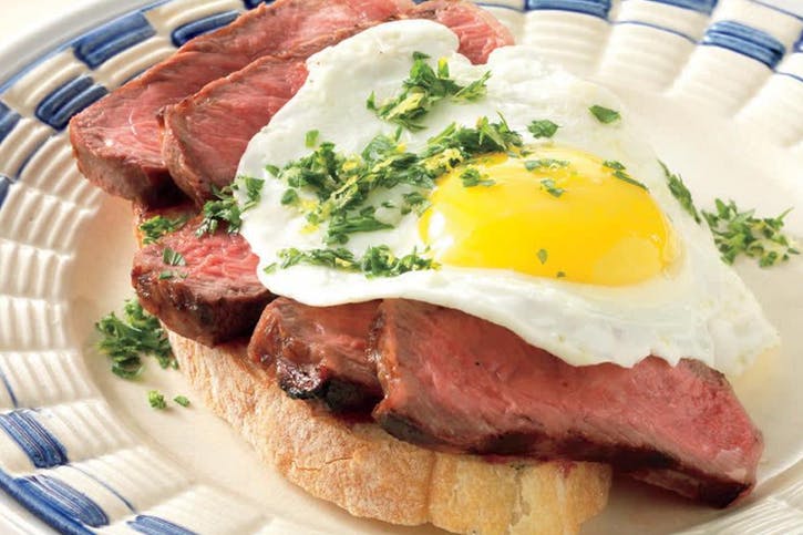 06 Rozdeľte steaky na tenké plátky. Na každú servírovaciu platňu umiestnite plátok toastového chleba (ak sa používa), na toast položte nakrájaný steak, na mäso položte vajíčko a posypte trochou gremolata. V prípade potreby pridajte trochu feferónkovej omáčky. Podávame teplé.