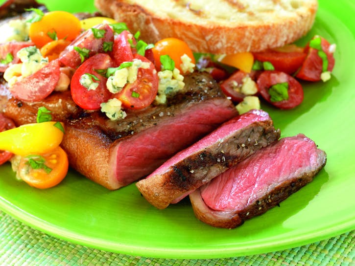 04 Grilovacie mriežky vyčistite. Steaky grilujte na priamom horúcom mieste so zatvoreným vekom, kým nie sú uvarené na želanú konzistenciu, 6 až 8 minút pre stredne prepečené, jedenkrát alebo dvakrát otočte (ak dôjde k vzplanutiu, posuňte steaky dočasne nad nepriame teplo). Vyberte z grilu a nechajte ho pôsobiť 3 až 5 minút. Pridajte syr do zálievky. Opatrne premiešajte. Teplé steaky podávajte so zálievkou na vrchu.