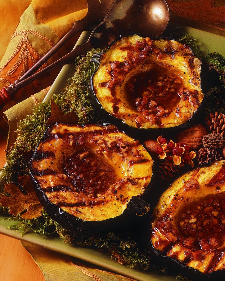 04 Mriežky na varenie vyčistite. Polovicu tekvice grilujte, rezané strany nadol, na nepriame vysoké teplo, so zatvoreným vekom, približne po 30 minútach sú zreteľne viditeľné značky grilu. Otočte polovice tekvice, rezané strany nahor. Natrite dužinu pekanovým maslom a pokračujte v grilovaní so zatvoreným vekom, kým nie je dužina jemná, o 20 až 30 minút viac. Vyberte z grilu a podávajte teplé.