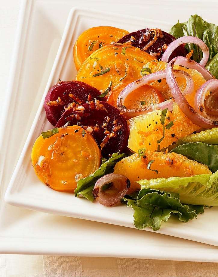 05 Vypláchnite listy cukrovej repy pod studenou vodou. Vyberte najmenšie, najkrehkejšie listy a vložte do rímskeho šalátu vo veľkej mise. Pridajte polovicu dresingu a premiešajte. Rozdeľte šalátovú zmes medzi štyri šalátové taniere. Navrch dajte repu s cibuľovými krúžkami a pokvapkajte zvyšným dresingom. Podávajte teplé alebo pri izbovej teplote.