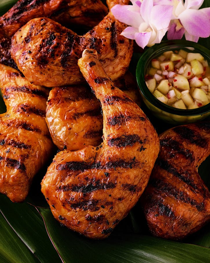 04 Vyberte kurča z vaku a marinádu zlikvidujte. Mriežky na varenie vyčistite. Kuracie mäso grilujte najprv kožou smerom nadol, na priame teplo, so zatvoreným vekom, až do zlatohneda, 8 až 10 minút, raz otočte. Potom kurča premiestnite na nepriame stredné teplo, zavrite veko a pokračujte vo varení, kým nedôjde k vyčereniu štiav a kým mäso už nie je ružové v kosti, 40 až 50 minút. Vyberte z grilu a nechajte ho pôsobiť 3 až 5 minút. Podávame teplé.