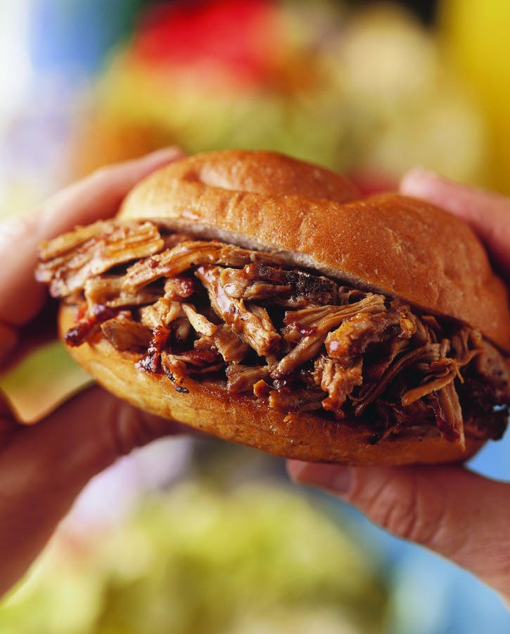 05 Jemne nakrájajte, nakrájajte alebo trhajte mäso do kúskov prstami alebo dvoma vidlicami. Zlikvidujte všetky veľké kúsky tuku. Mäso polejte trochou omáčky a dobre premiešajte v miske. Opečte buchty na priamom ohni asi 30 sekúnd. Potrhané bravčové mäso podávajte na buchty teplé so zvyšnou omáčkou.