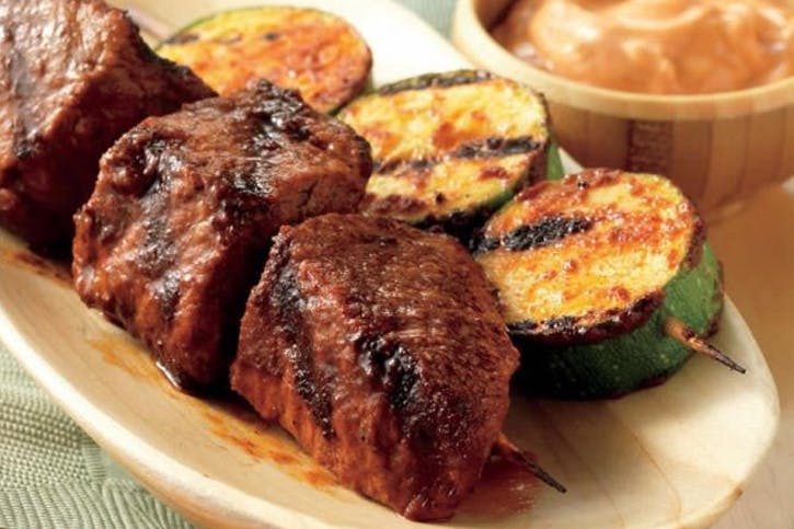 05 Mriežky na pečenie vyčistite. Špízy s tromi hrotmi a cuketové špízy grilujte na priamom a strednom ohni so zatvoreným vekom, až kým sa mäso pekne nespáli a cuketa nebude chrumkavá, 4 až 6 minút, otáča sa raz alebo dvakrát. Vyberte z grilu a nechajte ho pôsobiť 3 až 5 minút. Podávajte teplé s aioli.