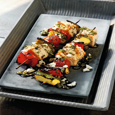 Špízy grilujte 3-5 minút nad priamym žiarom s uzavretým vekom, kým ryba nezíska svetlo hnedé sfarbenie a vnútri nebude ružová (podľa Vašich preferencií). Špízy raz alebo dvakrát otočte. Špízy dajte na tanier, pokropte octovú zálievkou, posypte kozím syrom a ihneď servírujte.