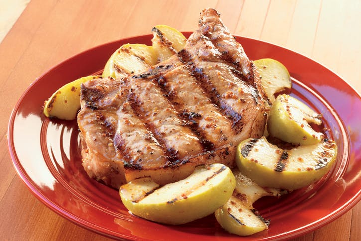06 Grilujte kotlety na priamom a strednom ohni so zatvoreným vekom, kým sú v strede ešte nepatrne ružové, 8 až 10 minút, otáčajte raz alebo dvakrát. Vyberte z grilu a nechajte ho pôsobiť 3 až 5 minút. Kotlety podávame s grilovanými jablkami.