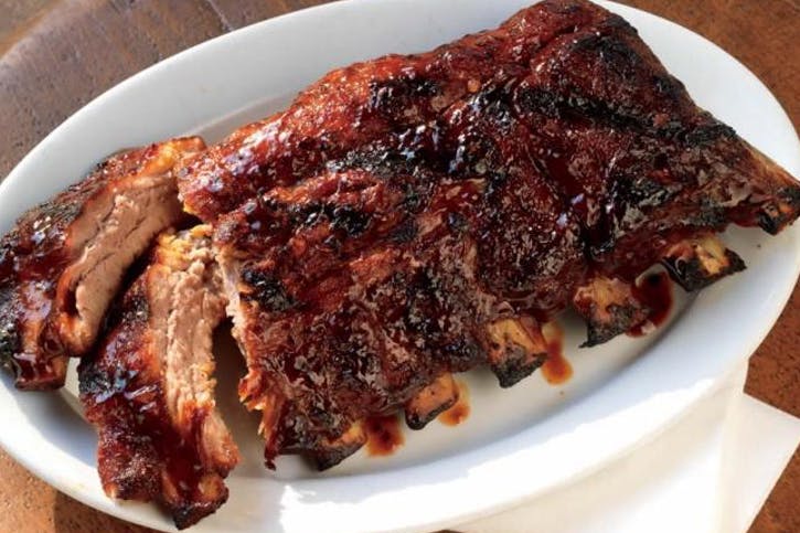 08 Drevené štiepky pridajte na uhlie alebo do údiacej skrinky na plynový gril podľa pokynov výrobcu a zatvorte veko. Keď drevo začne dymiť, vráťte rebrá do grilu, kostnou stranou nadol. Grilujte na priamom strednom ohni so zatvoreným vekom, 10 až 12 minút, s omáčkou raz alebo dvakrát otáčajte a polejte. Vyberte z grilu a nechajte asi 5 minút odpočívať. Nakrájajte na jednotlivé rebrá a podávajte teplé so zvyšnou omáčkou.